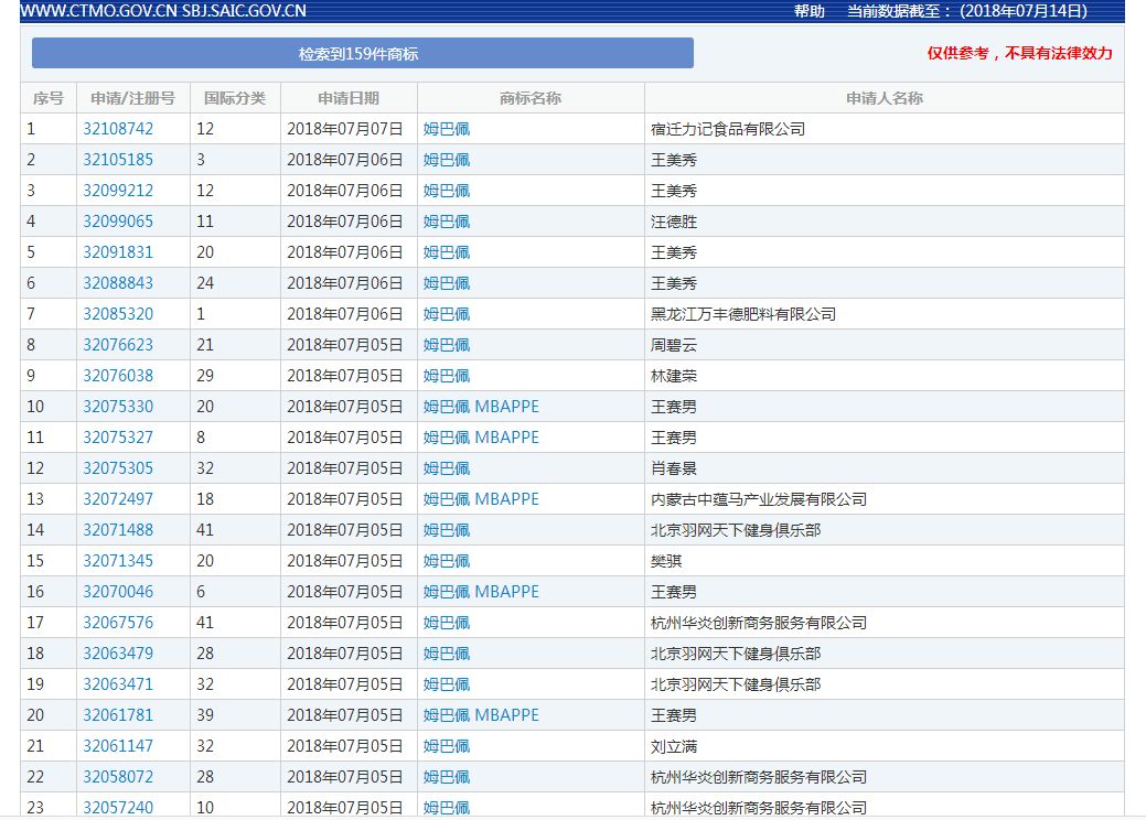 Mbapp火了,有心人迅速瞄準商機,紛紛申請注冊其商標。比賽第二天,國家商標局收到27份“Mbapp”或“Mbapp MBAPPE”商標注冊申請。第三天,申請人數上升到58人。截至7月14日,已有159人申請注冊“Mbapp”或“Mbapp MBAPPE”商標,涉及各個行業。