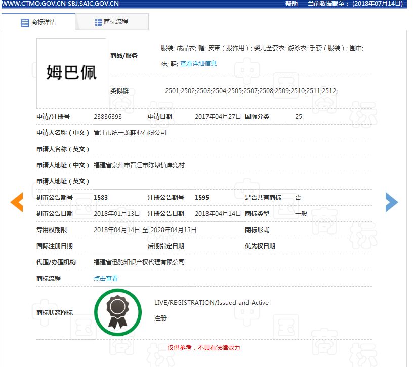 從2017年到本屆世界杯開始,商標局只受理了17件這樣的申請。由于申請提交時間為2017年,晉江同益隆鞋業有限公司已獲準在服裝等商品上使用“Mbapp”商標;丹陽瑞金眼鏡貿易有限公司也被批準用于眼鏡和其他商品。除了上述兩家公司,最近提交的商標申請大部分都在等待受理,暫時無法查詢詳細函件。