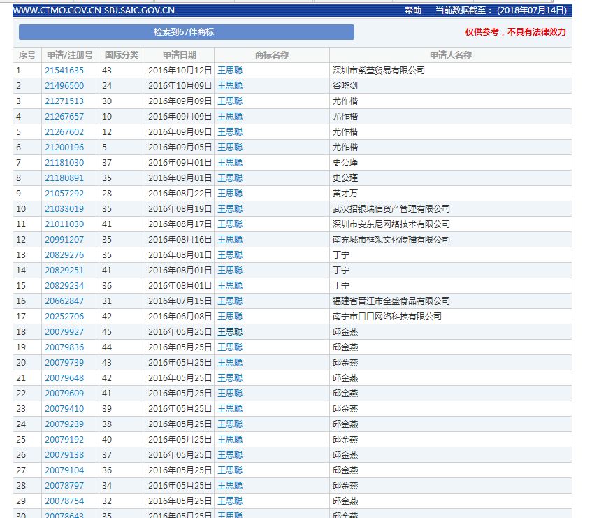 眾所周知,明星的影響力是巨大的,尤其是他們自身的品牌效應,一舉一動都能為代言品牌帶來大量的關注。看到了自己的價值,越來越多的明星有了自己的品牌,甚至將自己的名字注冊為商標,將名字的商業價值發揮到了極致。前段時間注冊了王思聰的名字和商標,也被搜到了。網友大呼土豪王思聰分分鐘買下商標。